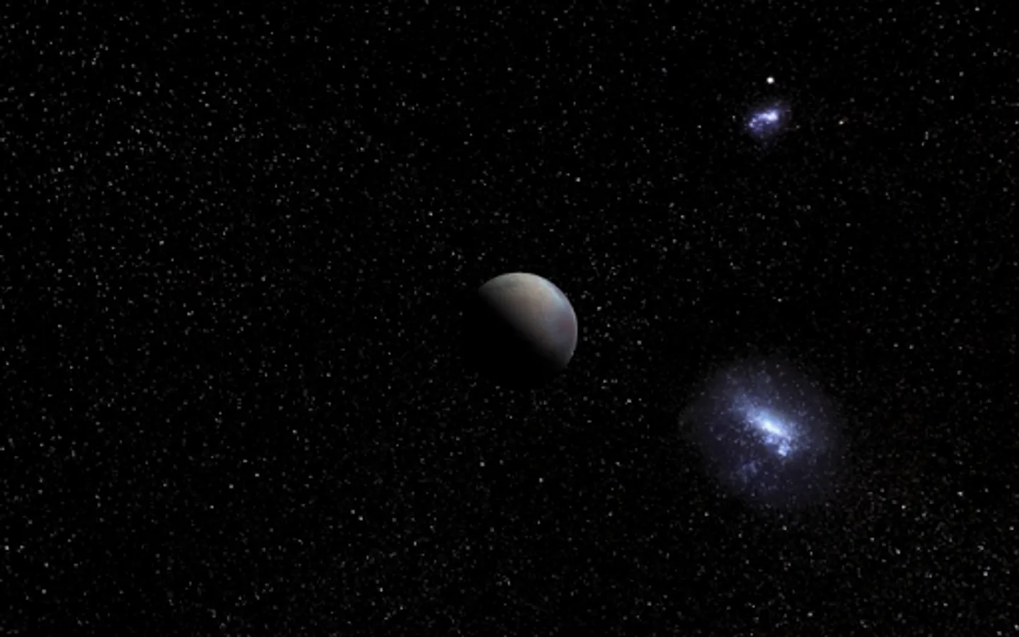 The largest known moons are present, as well as dwarf planets Ceres and Pluto.