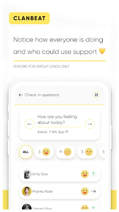 * Well-being support with: automated check-in questions, actionable data reports, mood statistics, and red flags.