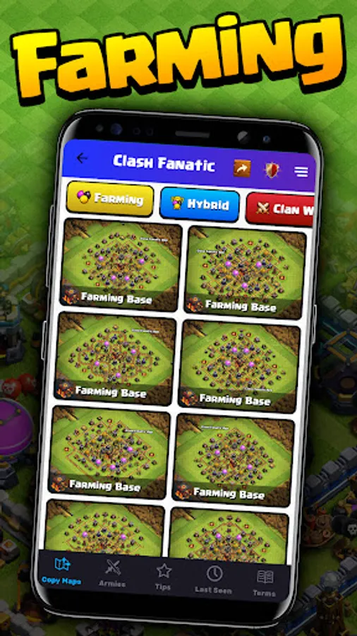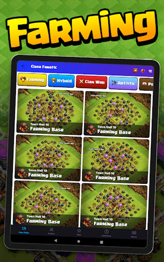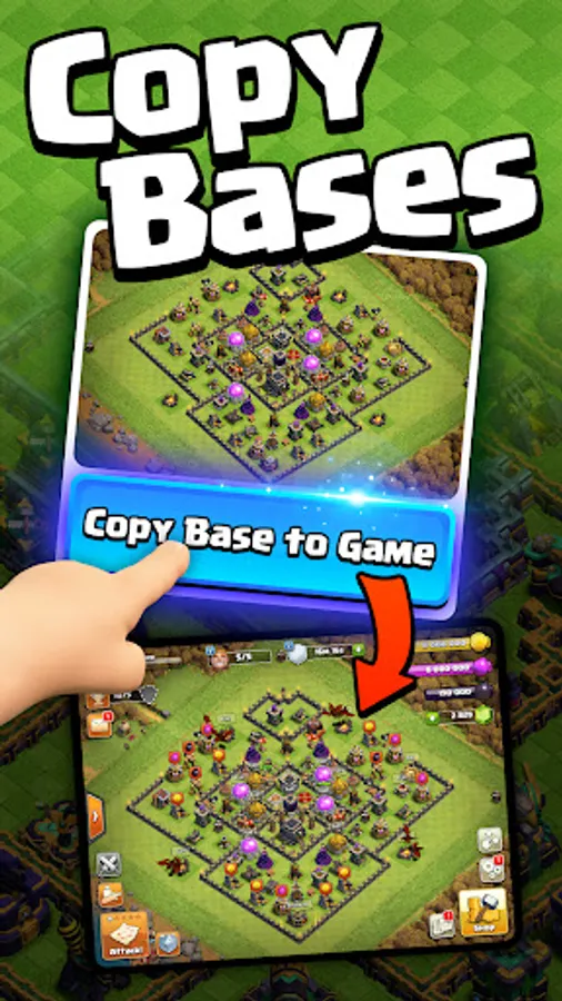 ● Bases for your Town Hall: - Copy base layouts from Town Hall 4 to Town Hall 15! Bases include Farming, Hybrid, Clan War/Trophy, Artistic/Funny and Progress.