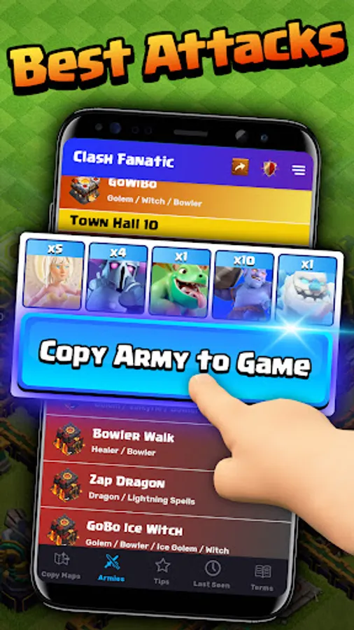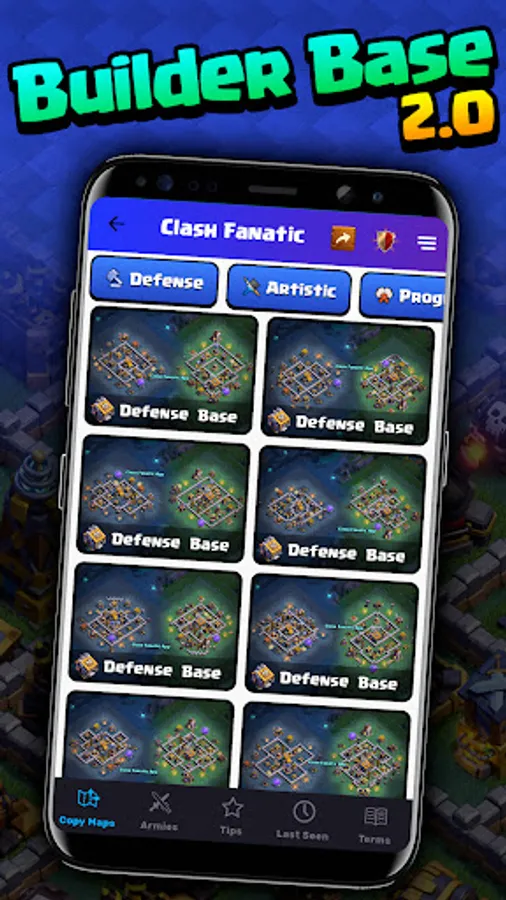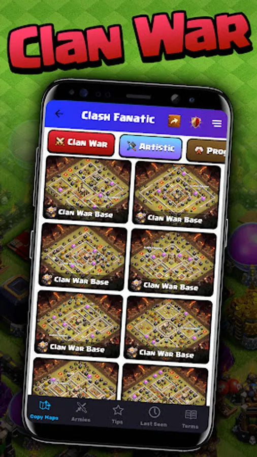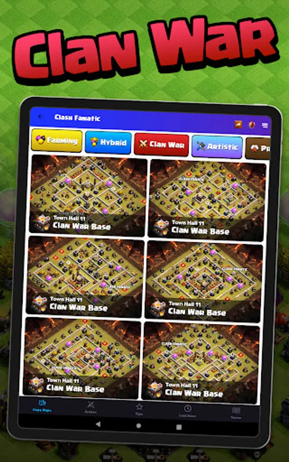 Clash Fanatic is the best base layout and strategy guide app for Clash of Clans. The app features copy maps for every level of Town Hall and Builder Hall, including farming maps, hybrid maps, clan war bases, progress bases and funny/artistic maps. Top army strategies with copy troop feature to teach you the strongest attacks for each level. Quick attack and defense tips provide easy tips you can utilize right away to help improve your clashing. All with a very easy to use design and interface. 🏆