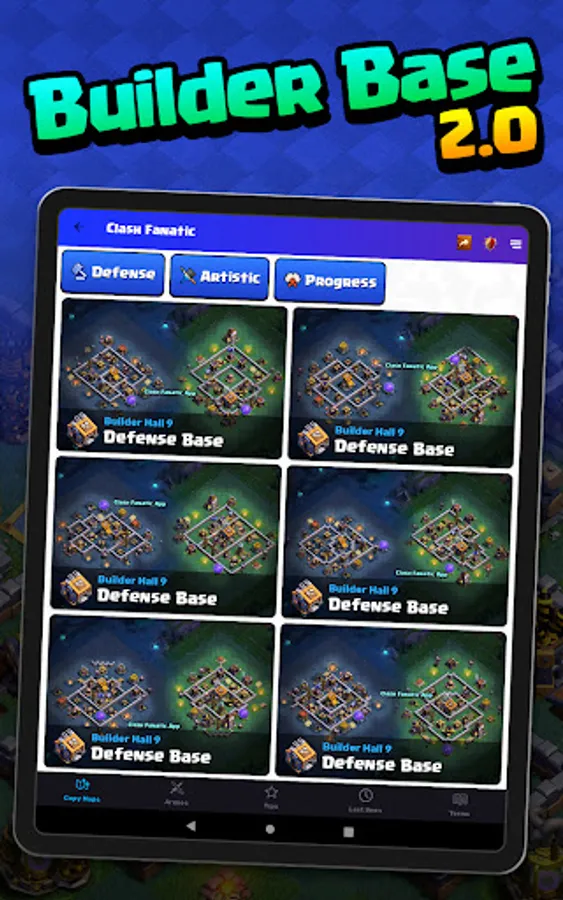 ● Bases for your Builder Hall: - Copy NEW Builder Base 2.0 layouts from Builder Hall 4 to Builder Hall 10! Bases include Defense, Artistic and Progress.