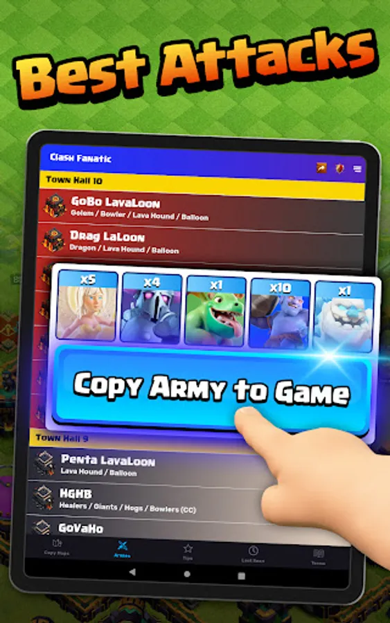 ● Armies for your Town Hall: - Copy attack strategies for Town Hall 5 to Town Hall 15!