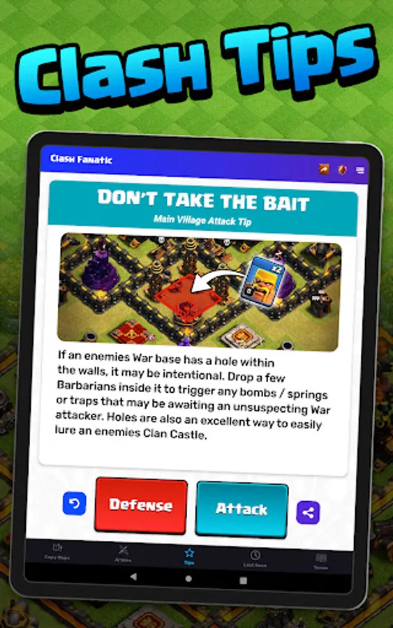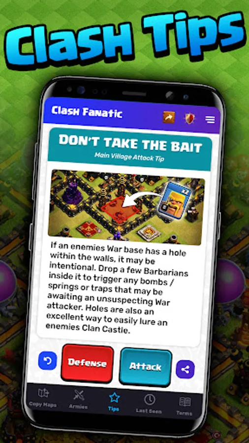 ● Defense tips: - Tips on base designing and layout strategies to help protect your loot and trophies.
