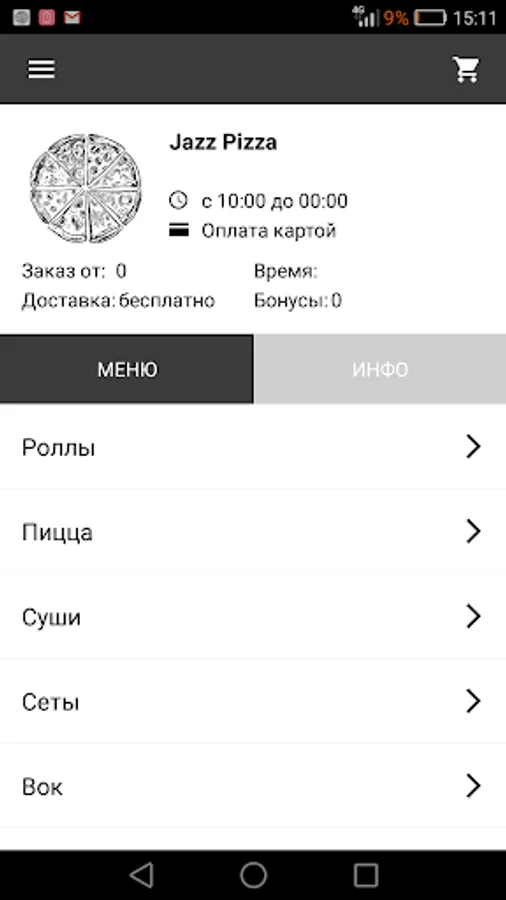 Mobile application for ordering and delivery of pizza, sushi, rolls, noodles, wok in the Jazz Pizza company.