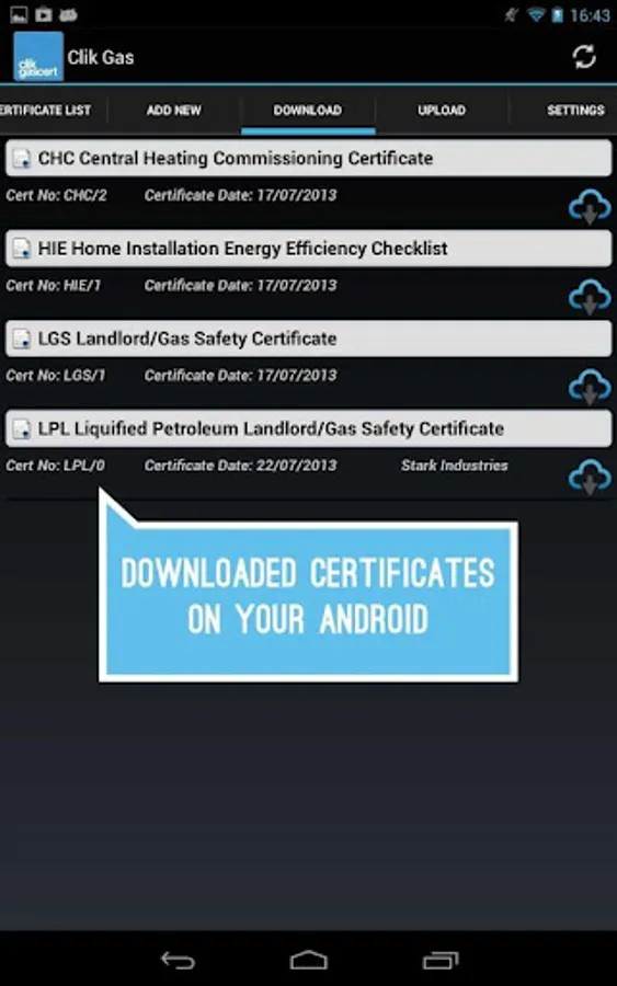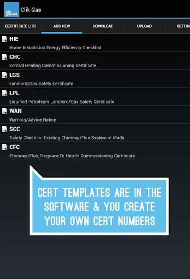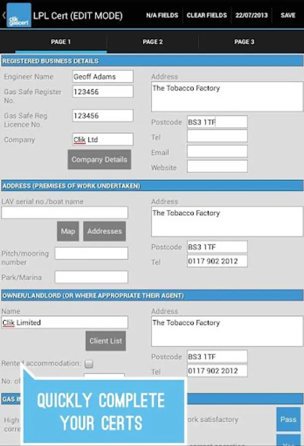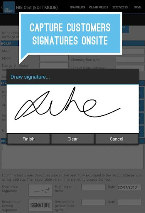 Quickly complete your certificates on your tablet, get a signature from your customer and send back securely via the Clik Cloud to your desktop software in the office.