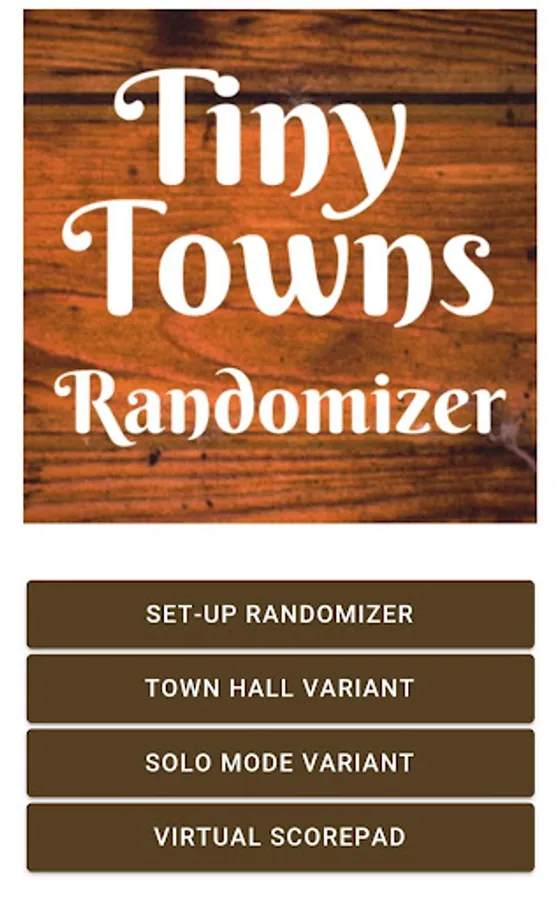 A utility app for Tiny Towns board game designed by Peter McPherson and published by AEG. This app makes it easier for player to randomize the building cards that will be used in the game - this eliminates the shuffling and randomly drawing of cards and greatly speeds up set-up. The app also acts as the Mayor in Town Hall variant and can also handle the Solo Mode, eliminating the use of resource cards in the game!