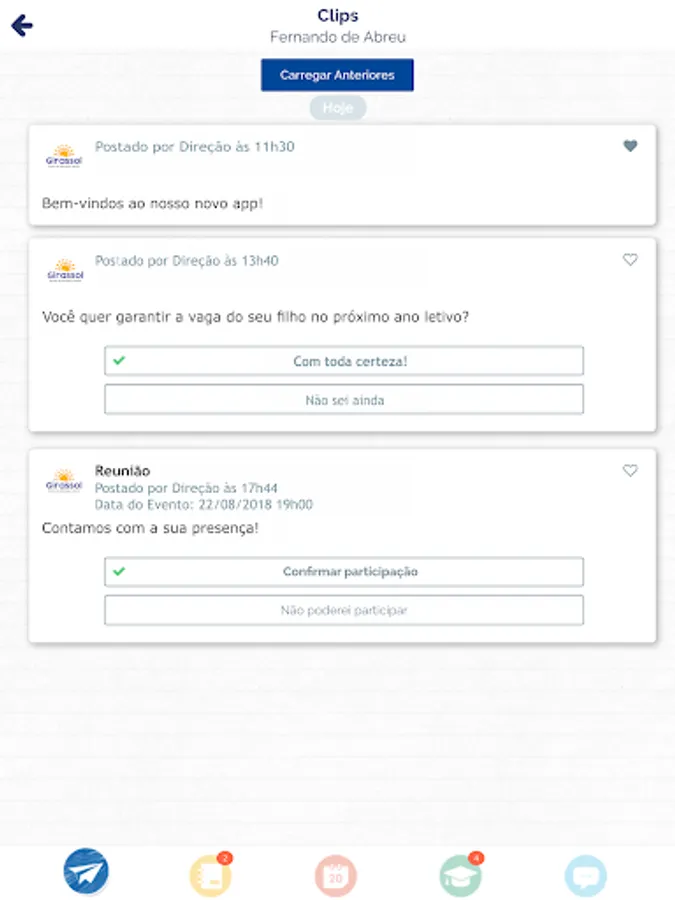 With this communication application, parents, guardians and teachers will be connected to the school in a structured, modern, simple, agile and efficient way, being able to receive the school announcements, the daily news of their children, the calendar of activities school, financial support among other facilities.