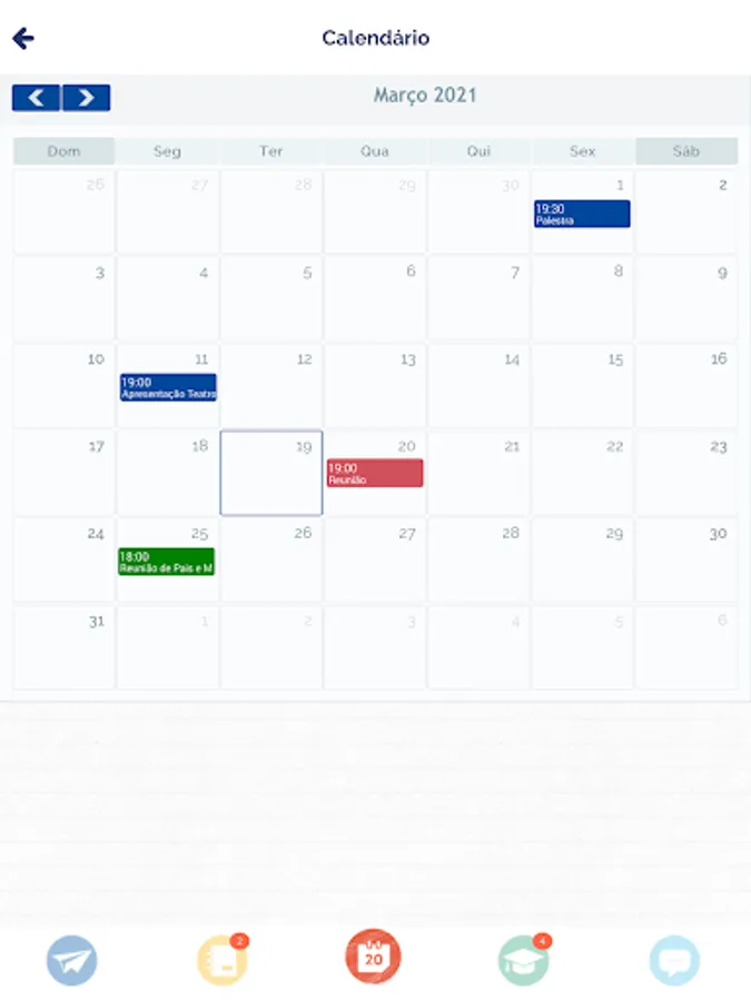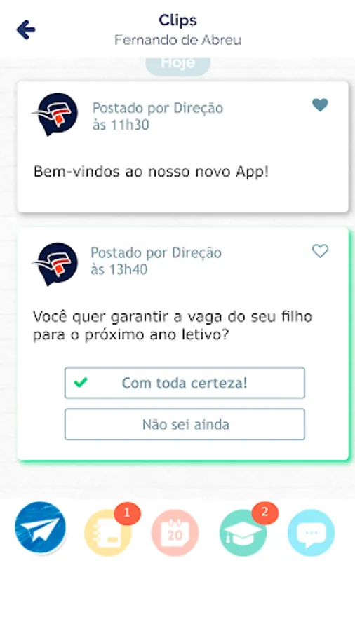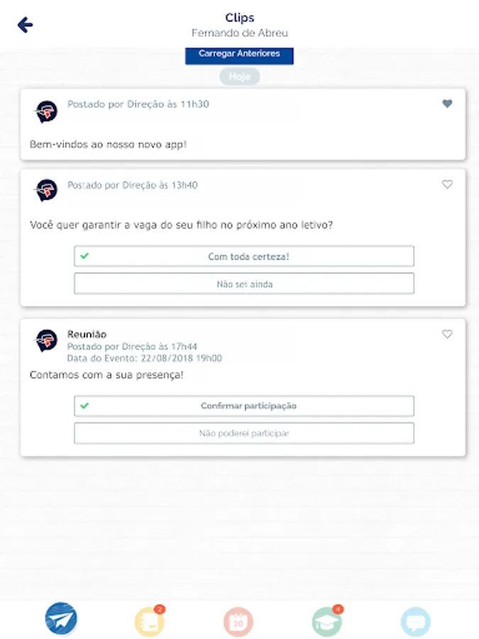 Welcome to the FEMA School Calendar! A COMMUNICATION and SERVICE platform, which covers all the details of the school routine, from the school calendar, messages for the classes and information about what happens at the School. It is worth noting that CLIP arrived to streamline communication with parents and students.