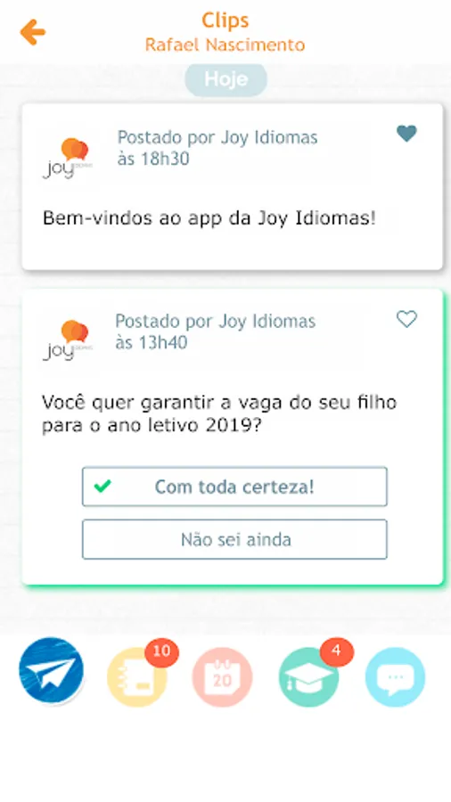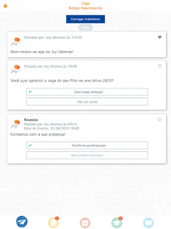 Joy Idiomas, in line with the contemporary world that yearns for efficient and sustainable innovations (without the use of paper), now offers its students and managers a mobile application (mobile phones / smartphones), to facilitate communication between all subjects linked to our institution (students, managers, employees, teachers, coordinators and management). This tool aims to be practical, agile and secure in the dissemination of information, such as school calendar, events, student performance bulletin, class summary, homework assignment, and general notices.