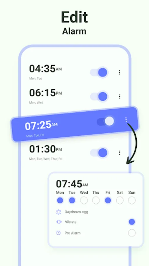 With a smart alarm you can sleep as much as you can, it will wake you up until you get up and leave your bed. Every morning, you don't have to worry about getting up late, going to work, or going to school late anymore. Simple Alarm Clock Unlike other alarm clocks for Android, Simple Alarm sorts your alarms in the order they will sound next so you can easily identify which are the tasks you have to do next if you are using Simple Alarm as a "To Do" tasks list.