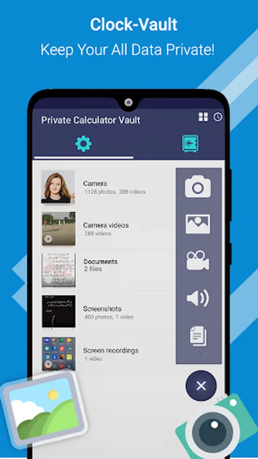 Capture photos and record videos from camera by this Gallery Lock and hide photos and video inside app.