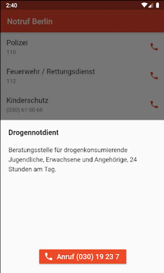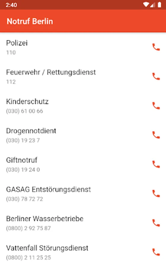 With emergency call Berlin they receive all important emergency call number for Berlin offline. So you do not have to search online for numbers in case of a case, but have them directly in the app.