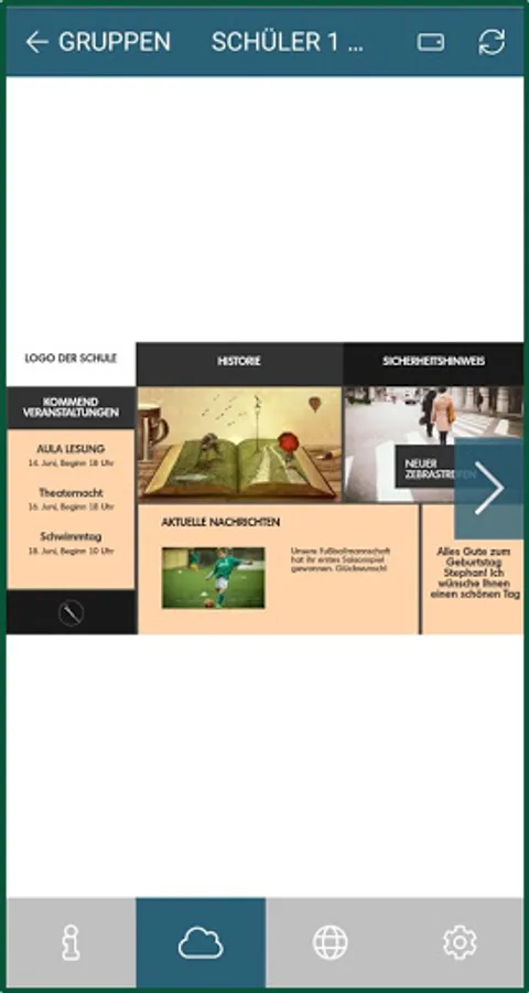 Brief information from your NewsBoard, slides from the signage presentation or pages such as substitution plans, websites or other documents can be accessed at any time by all students or your employees using the connectInfo app.