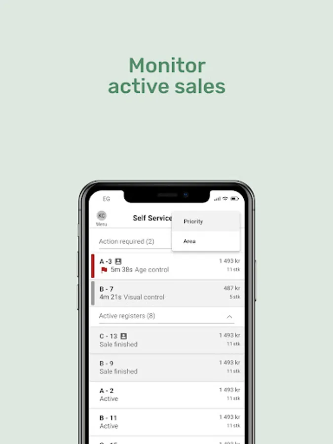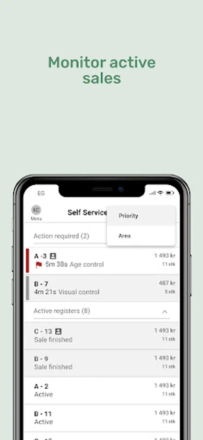 Self Service Monitor is an app that shows an overview of ongoing activities in Self Check Out registers. Self Service Monitor gets notifications when actions are required from the staff on the Self Check Out registers, and in some cases actions can be handled from the Self Service Monitor directly. The list of required actions are sorted based on how long the customer has needed help, and are flagged/not flagged depending on if actions can be handled from Self Service Monitor directly or is just a notification.