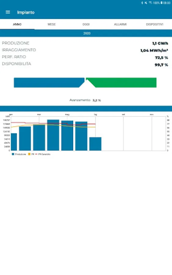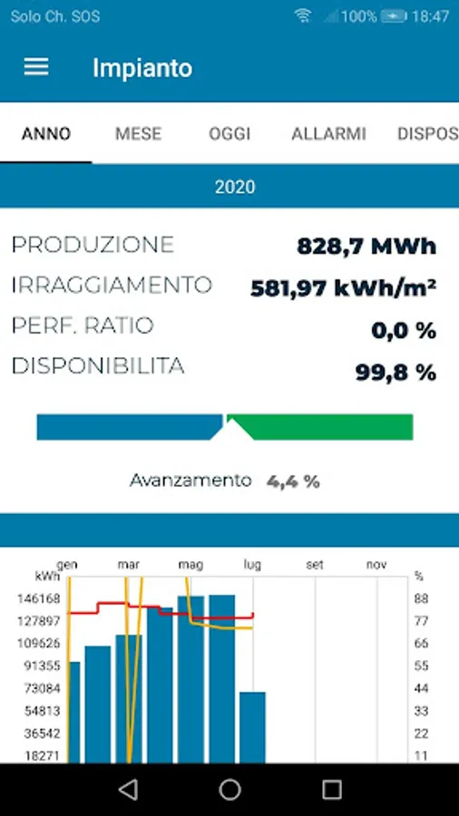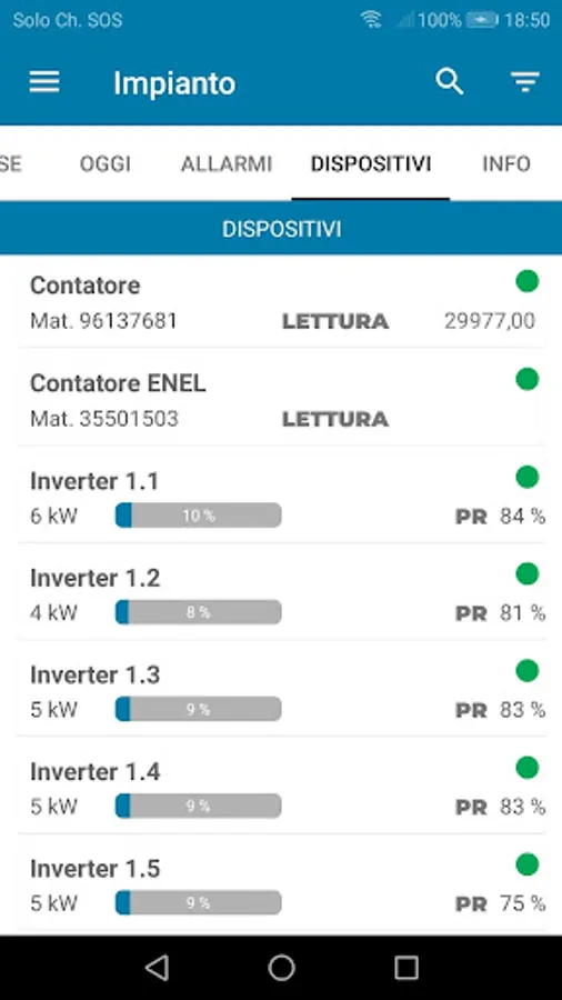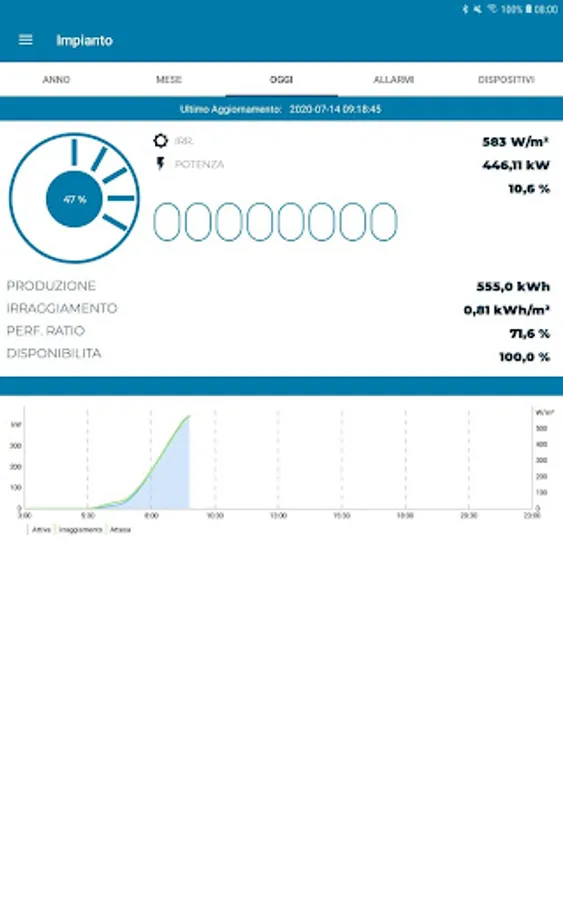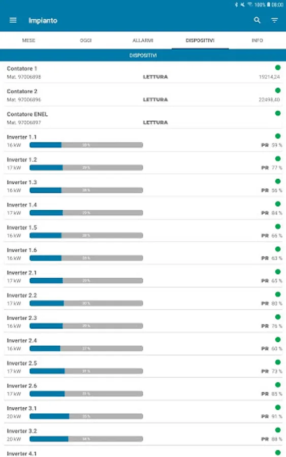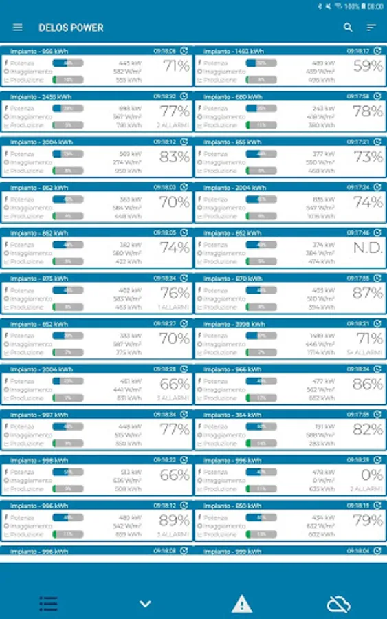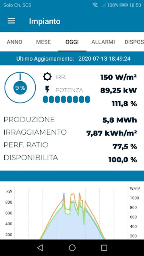 By reworking all the information acquired by the environmental sensors and acquiring all the electrical parameters of the installed components (meters, inverters, switches, ups, solarimeters, etc.), it allows you to evaluate in real time the actual level of performance, until you know the power ratio of each single string inverter.