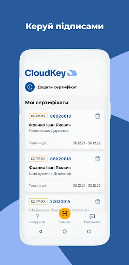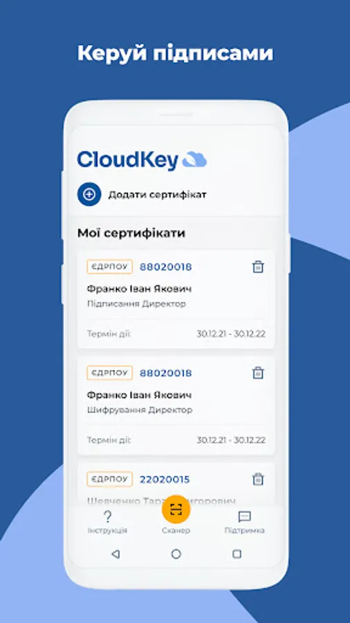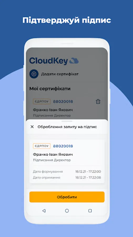 CloudKey mobile application is designed to authenticate users - owners of CEP from KNEDP LLC "CSK Ukraine", who keep their signatures in the cloud storage.