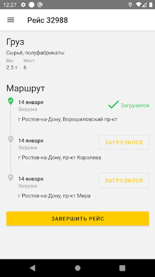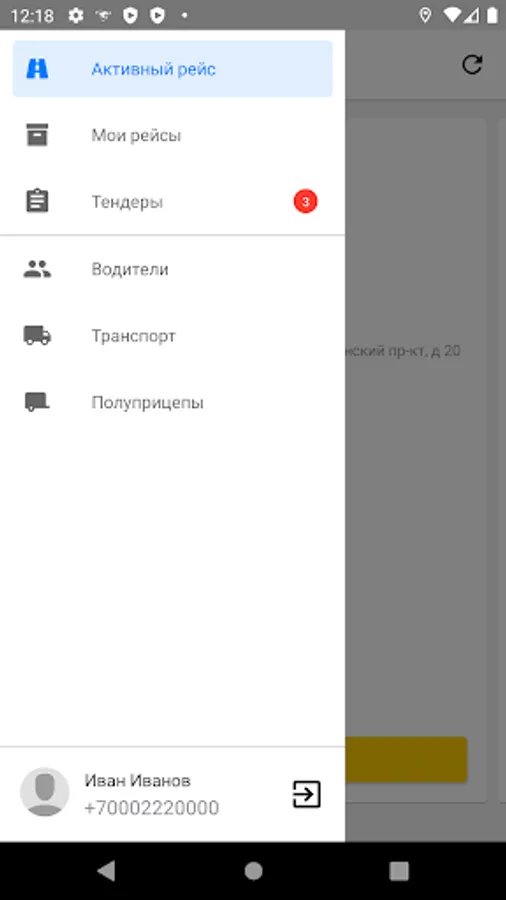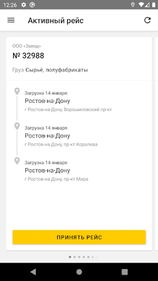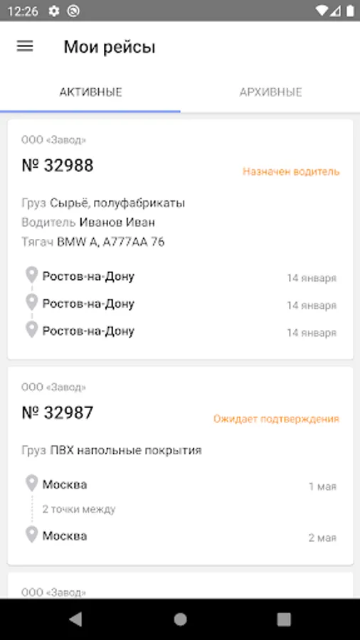 1. Active flight - selection of the current active flight, marking on loading / unloading points, tracking the location of the driver