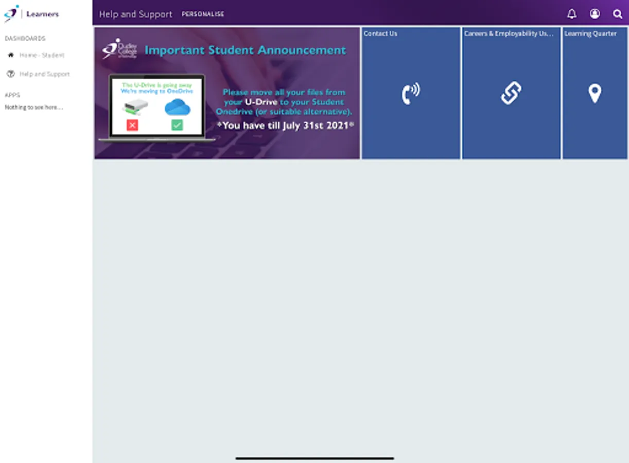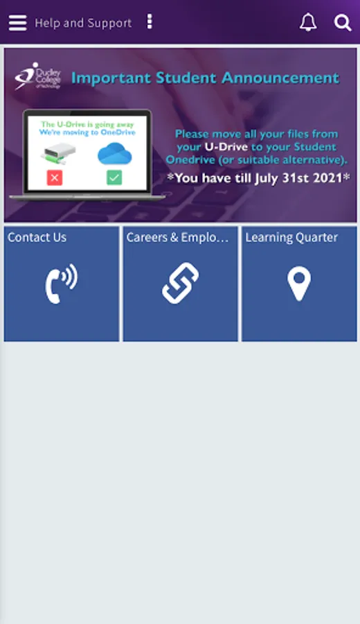 The MyDudleyCollege app provides an easy-to-use, personalised system for you to manage everything you need whilst studying. Giving you access to all key services in one place and with notifications, so you'll always be up to date with the latest news and information.