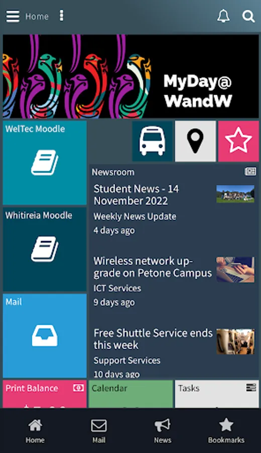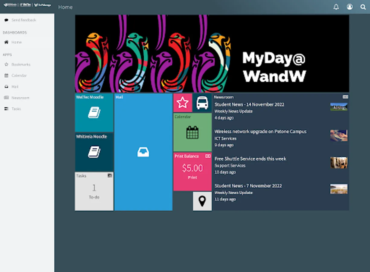 The Whitireia & WelTec MyDay app is your one-stop shop to access all student information and systems. Features include access to student news and events, your print balance, your own task manager, Moodle and much more!