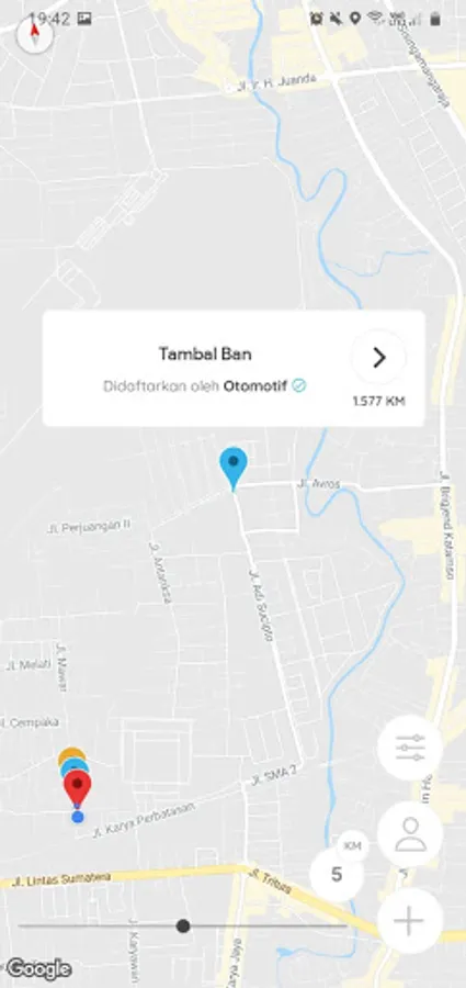 The automotive application is a map to find the location of a repair shop near you. a maximum distance of 5 KM, with the slider we provide to determine the distance you want.