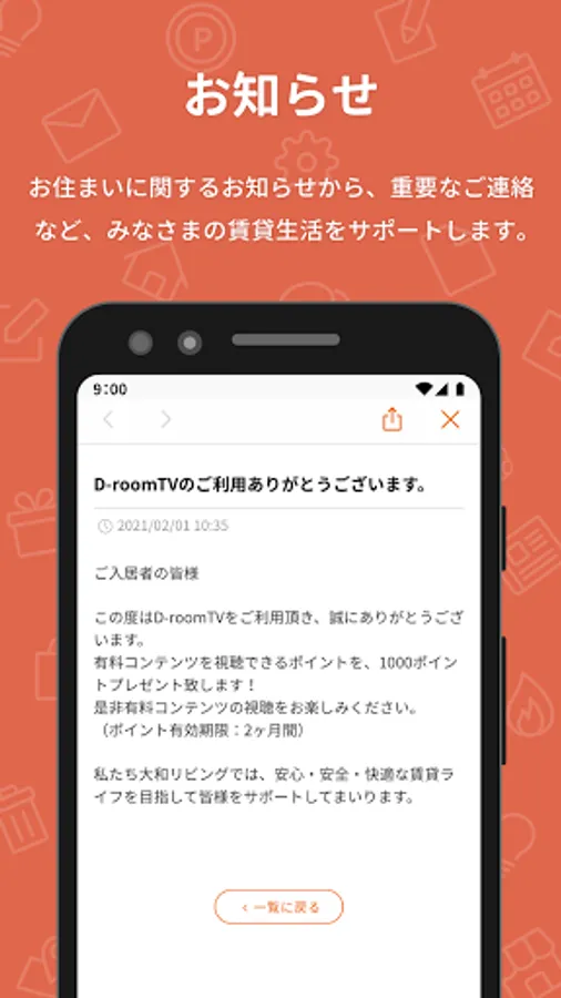 D-roomTV provides information on your area, deals from Daiwa Living, and services that allow you to enjoy movies, dramas, anime, and magazines. Please use D-room TV to accompany your enjoyable and comfortable life!