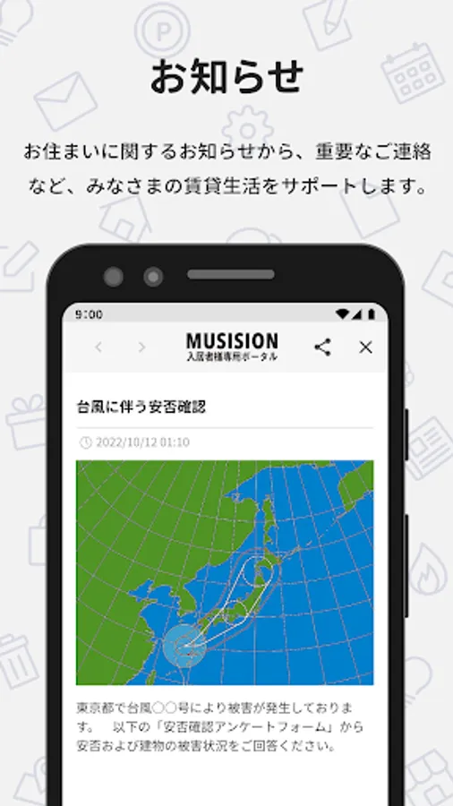 It is a dedicated app for tenants of properties managed by Libran Mind Co., Ltd. In addition to information on housing, various procedures and advantageous services are available.