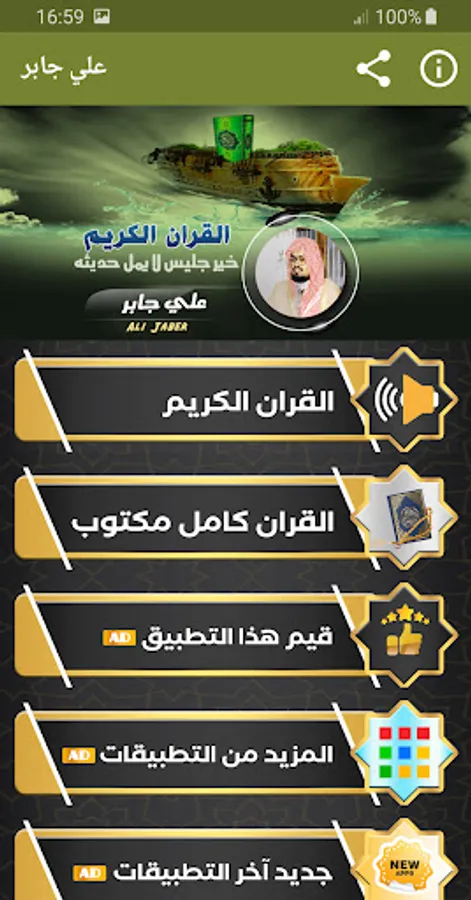 ◾️ A very wonderful application for the reciter Ali Jaber that contains the entire Holy Qur’an with high audio quality