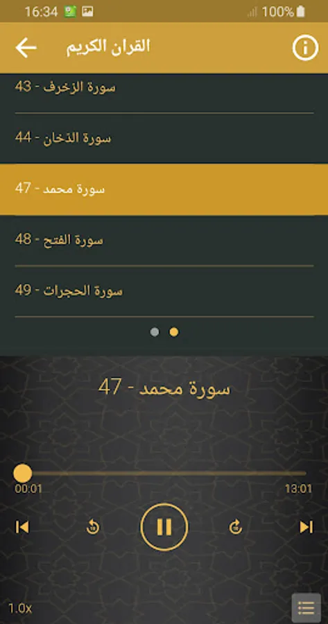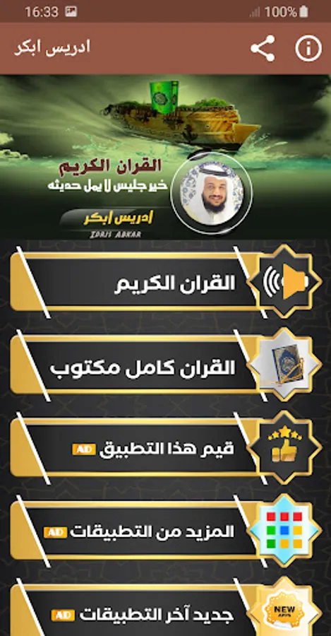 ◾️ A very wonderful application for the reciter Idris Abkar that contains the Noble Qur’an with high audio quality
