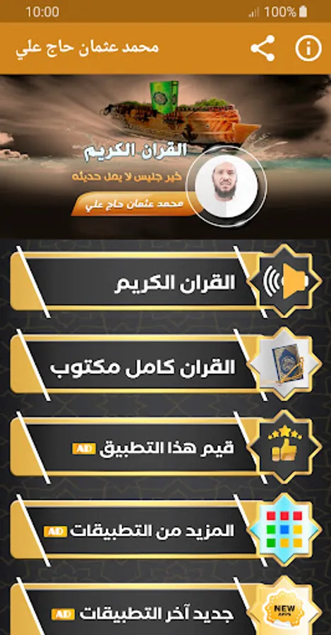 ◾️ A very wonderful application for the reciter Muhammad Othman Haj Ali, which contains the Noble Qur’an with high sound quality