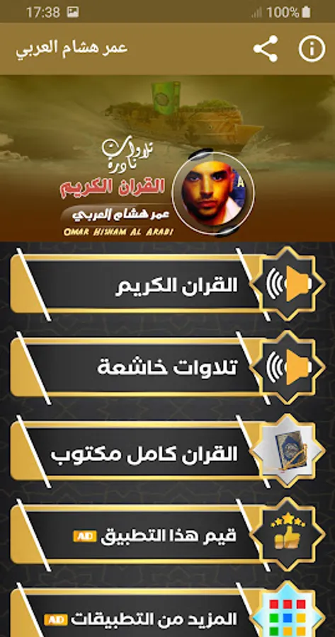 ◾️ A very wonderful application for the reader Omar Hisham Al-Arabi that contains the Holy Quran in high quality