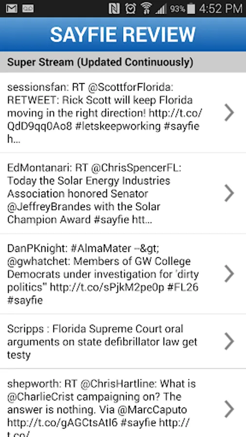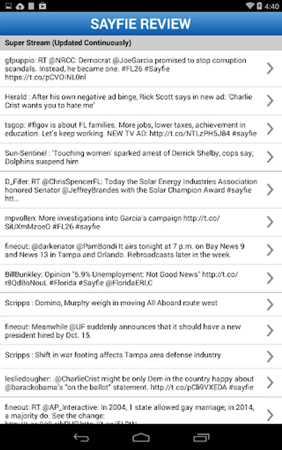 Our Android app provides you with our specially-curated FL political news SuperStream. The SuperStream is continuously updated 24/7 with blog posts, tweets, news items and editorials related to Florida politics. If you want to be the first to know, check the SuperStream regularly.