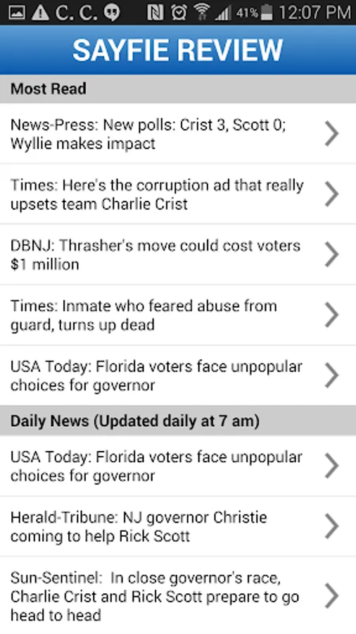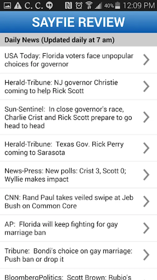 Described as the "online bible for Florida political junkies" by the Tampa Bay Times, Sayfie Review is what Florida's most influential people have been reading daily for more than 12 years. We provide our readers with the political news they need from over 50 FL news sources in an easy-to-read, streaming format. And, best of all, you can quickly and easily share any political news item via email, Twitter and Text (SMS).