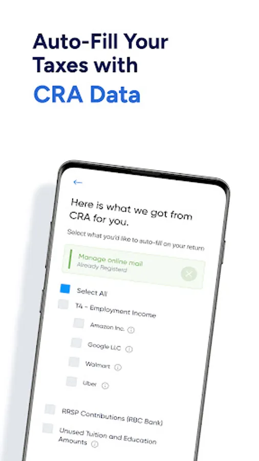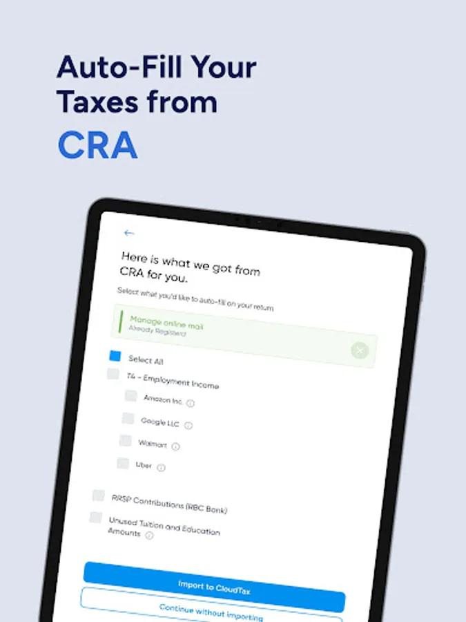 In addition to our powerful OCR feature, we're also excited to announce that CloudTax now offers the Canada Revenue Agency's Auto-Fill feature. With Auto-Fill, you can easily import information directly from the CRA, including your employment income, RRSP contributions, and more.