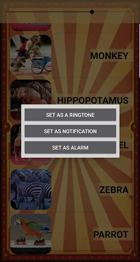How happy have you been when you had heard the announcement from a truck saying that the circus has come to your city? Do you like to watch the tricks of animals and acrobats? Do you remember all those crazy sounds from circus? Do you want to return to the time when your parents had lead you to the circus and to reminisce that memories? Hesitate no more, because sounds from circus is perfect application for you! Sounds from circus offer you 70 amazing sounds for your entertainment. Plenty of music, animals and more of a show moments. Each sound can be used for ringtone, notification or alarm sound. Just need to download app for free, and entertain yourself.