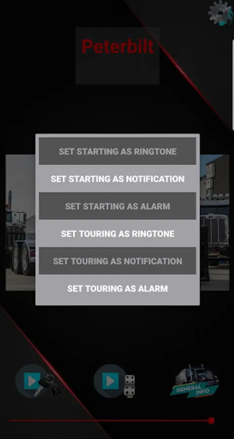 Are you a fan of big wheels, mighty trucks, and vehicles for long distance? Don't you just love to feel the strength of mightiest trucks on the planet? No matter if you are just an enthusiast, or perhaps a truck driver, we have all it takes to make you entertained reminiscing beautiful sounds of a trucks. Sounds of a truck is application is for all truck enthusiasts. You can find sounds of a cold engine start or engine at maximum speed of the most popular trucks from brands like Volvo, Mercedes, Scania, Renault and more. Sounds of a truck offers you an ability to set your favorite sounds as a ringtone, notification or alarm sound on your android device. What remains for you is to download this free application and have a wonderful time listening the sounds of your favorite truck. Tell us in comments what you think about the app, and we will try to make application better in updates.