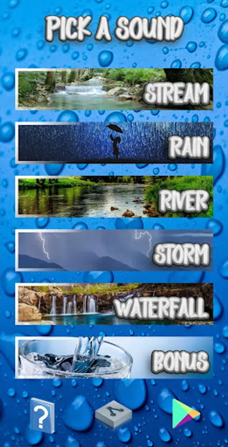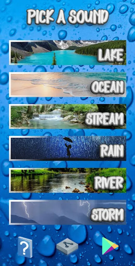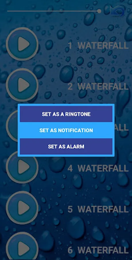 Water sounds are one of the best sounds for relaxation, and if you are looking for something that will relax your brain from stress, then this app will be perfect for you. App is free to download, and it contains huge collection of water sounds. Listen to Niagara Falls, or mighty waves of Atlantic ocean. For ultimate relaxation we suggest calm river sounds or beautiful sound of rain. Find much more amazing sounds, and if you would like to hear something more that isn't already in our application, please comment, and we will fulfill your wishes in updates. All sounds are realistic, and each sound can be used as a ringtone, notification or alarm sound. For better relaxation, we recommend you the use of a headphones. That way you will eliminate the noise from your environment and you will enjoy at maximum level, listening only the sounds from your android device. Download now and have a wonderful time using this app