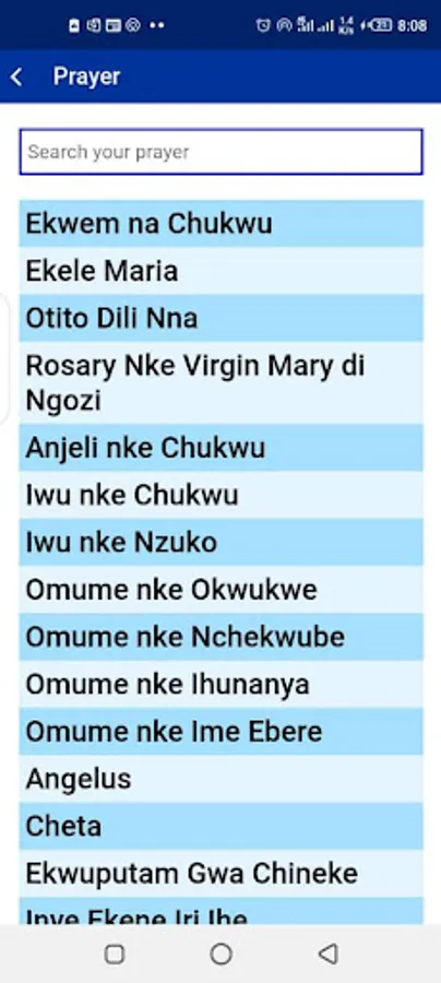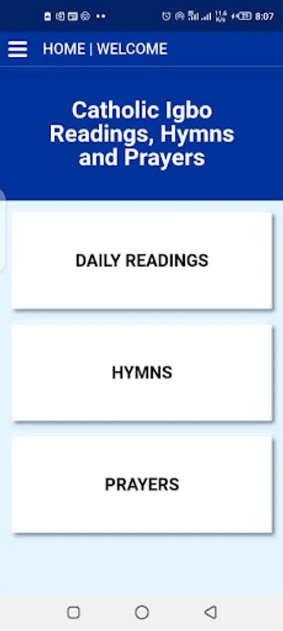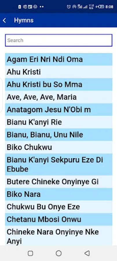 The app Catholic Igbo Readings, Hymns and, Prayers is an app developed for Christians and contains daily readings in Igbo and English, and Hymns and Prayers in Igbo. The application contains some basic features like a search button to search for over 50 songs and prayers.