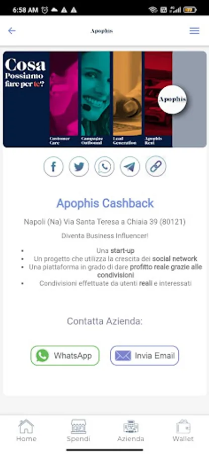 Apophis Cashback is a commercial platform whose main purpose is to put consumers in contact with the companies participating in the network by sharing multimedia content which has a referral link inside which identifies and guarantees the assignment of commissions.