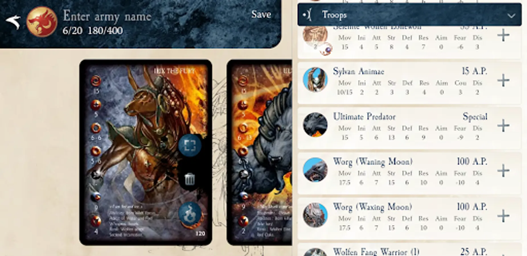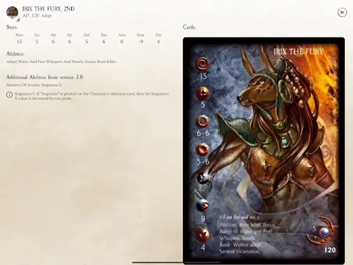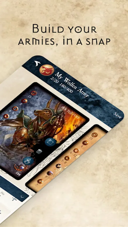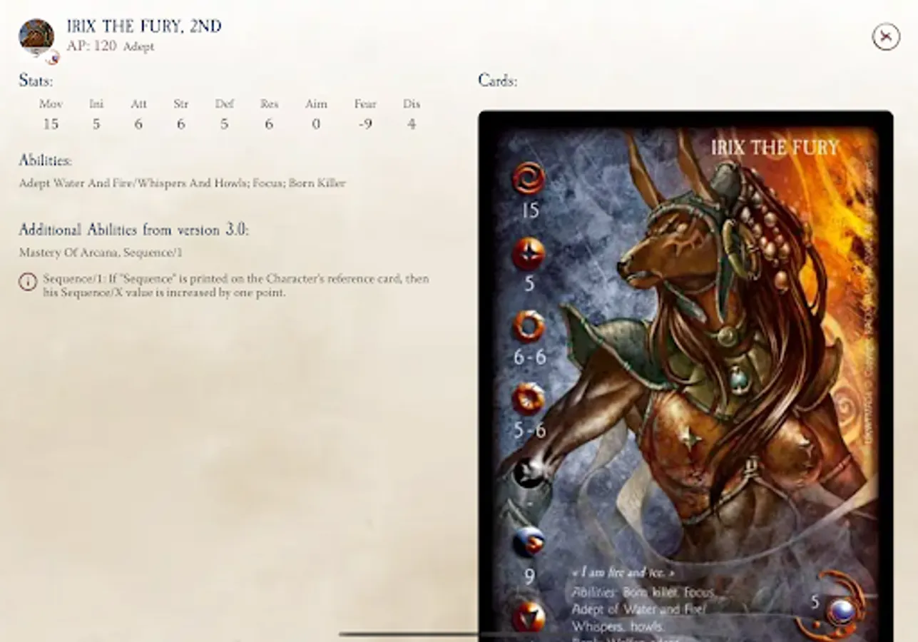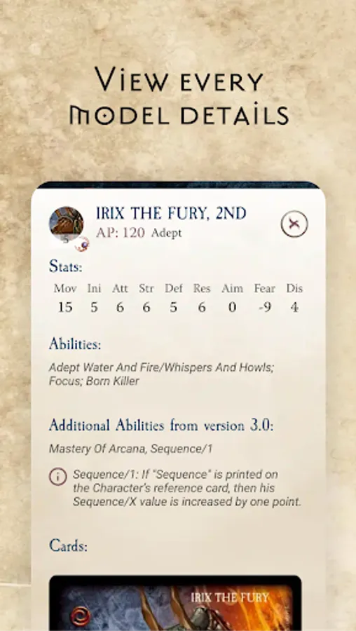 • Fighter Stats: Each Model stat cards is shown as they were printed, as well as in a convenient text view, to reference them easily and fully understand what each model brings to the battle.