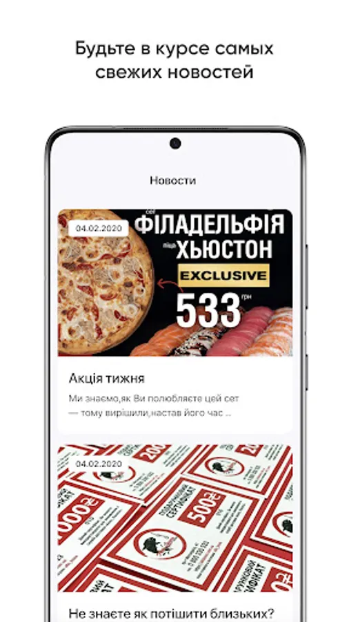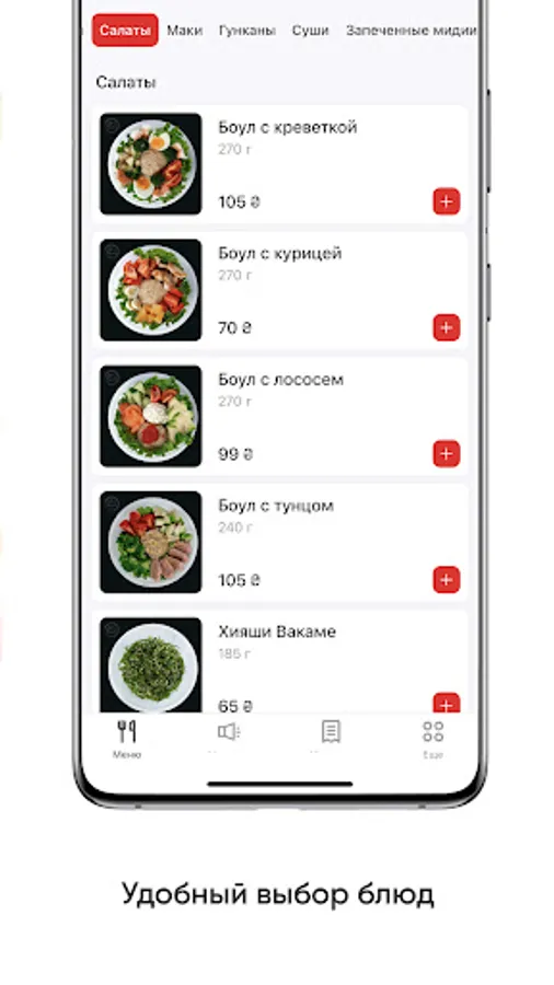 Using the mobile application, you can easily order pizza for every taste and size. Also in our menu you will find sushi, rolls, salads, desserts, hot snacks and more. Sorting by price, detailed descriptions and high-quality photos of dishes available in the application will help you choose exactly what you want.
