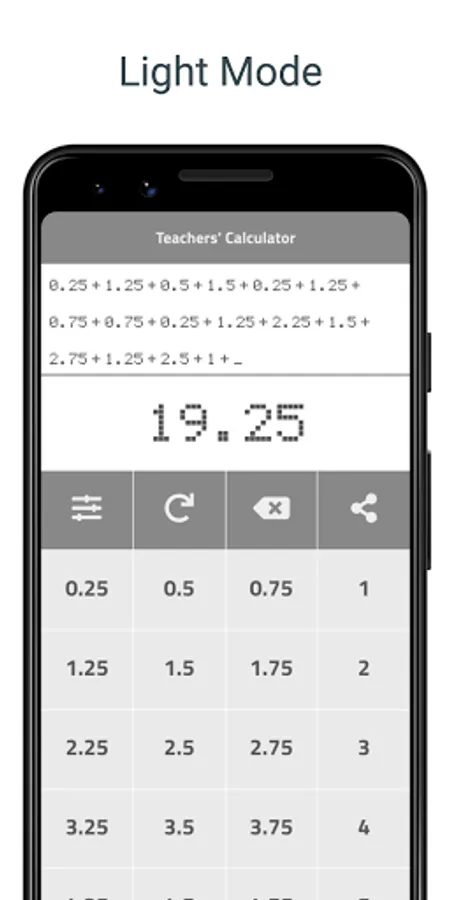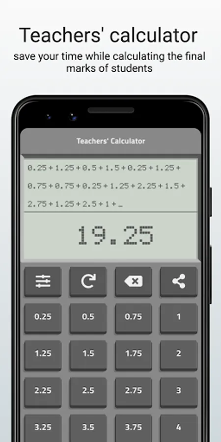Teachers' calculator feature a fully customizable grid of marks/scores and includes the feature of adjusting the values within scores marks/buttons, to any desired value. At classroom or home, the Teachers' marks calculator is your companion with its friendly interface that is easy on the eyes with its 3 suggested themes (classic, dark and light).