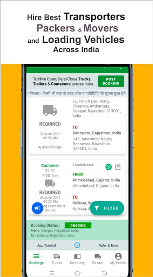 घर, दुकान, फैक्ट्री और ऑफिस का माल, पार्सल, समान भेजने और मंगवाने के लिए Tempo, Truck, Containers, Trailers, Transporters, Packers and Movers बुक करे अपने स्मार्टफोन से ।