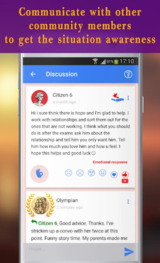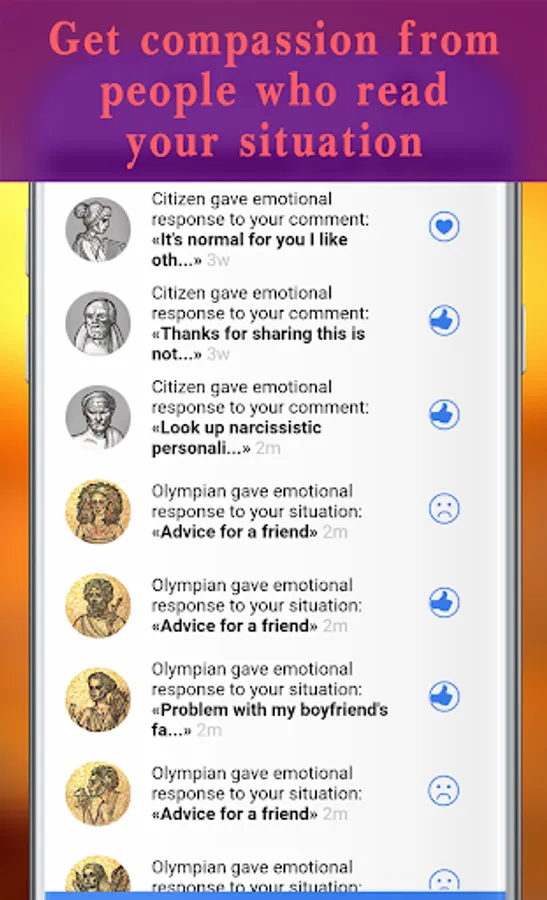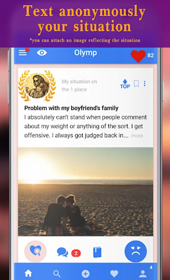 Olymp is a social app that helps to find new solutions in difficult 😓 psychological situations (relationship advice, marriage issues: divorce or breakup). Get real ❤ emotions and have an 🎯 advice from other app users in a common or private way. All stories, comments and messages are FREE and ANONYMOUS.