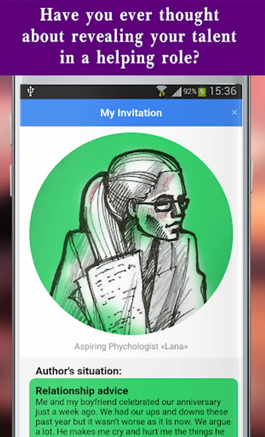 Psychologist - a mobile application in which you can try yourself in a role as an aspiring psychologist in a chat. In order to try to help people - just follow the recommendations in the "Tips" section in the app.