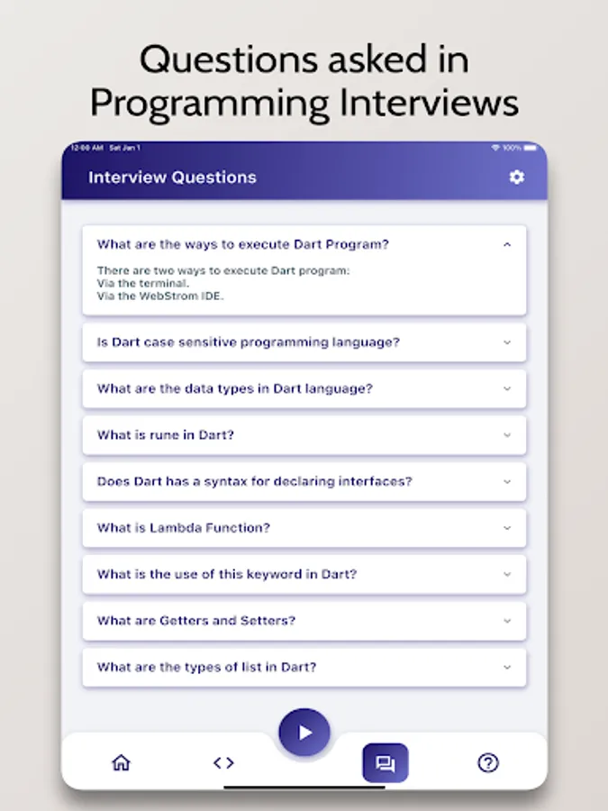Whether you want to learn Dart Programming as a Hobby, for School/College, or want to build a Career in the field, this Tutorial is for you. The tutorial covers everything from the Basics of Programming to Advanced Concepts like Data Structures. It also comes with a sleek and interactive graphical user interface.