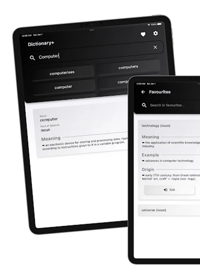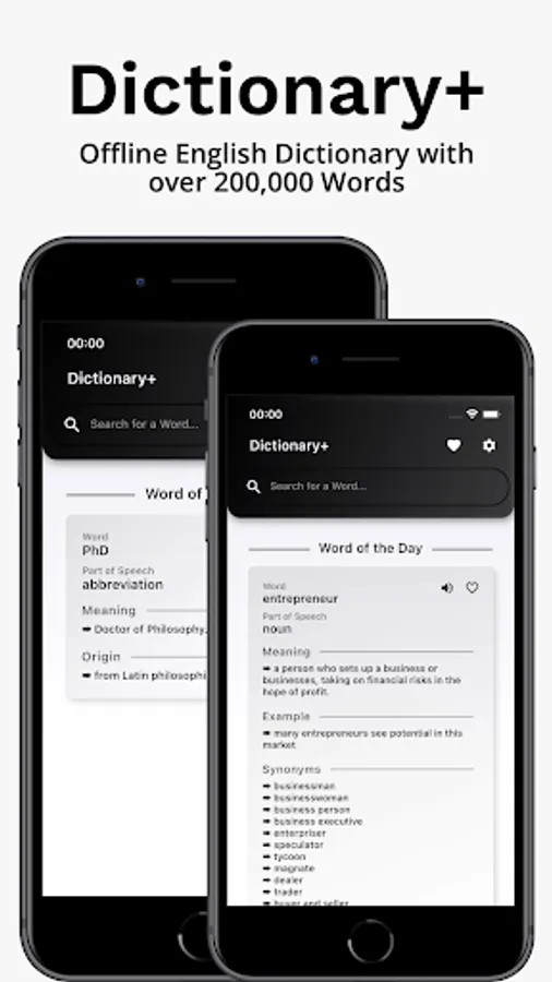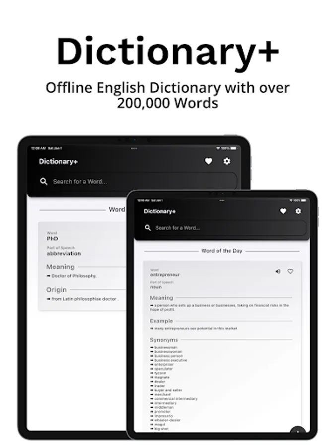 Free and Offline English Dictionary with over 200,000 Words available with No Ads or In-App Purchases. It comes with a sleek, interactive and customizable graphical user interface which can be modified to your liking.