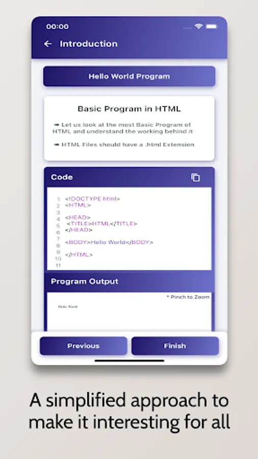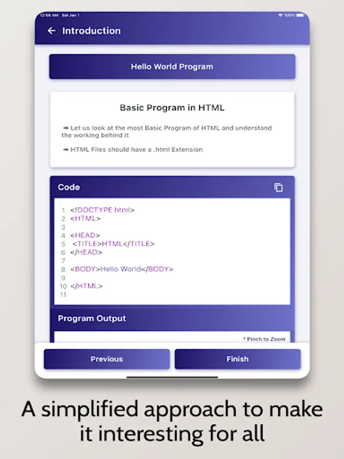 Whether you want to learn HTML Programming as a Hobby, for School/College, or want to build a Career in the field, this Tutorial is for you. The tutorial covers everything from the Basics of Programming to Advanced Concepts. It also comes with a sleek and interactive graphical user interface.