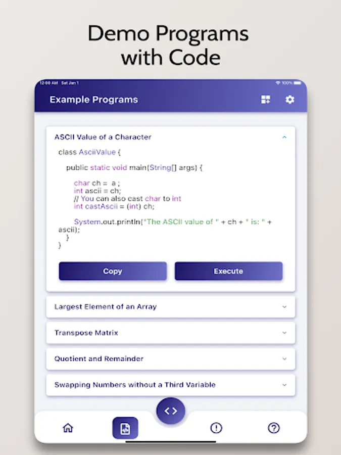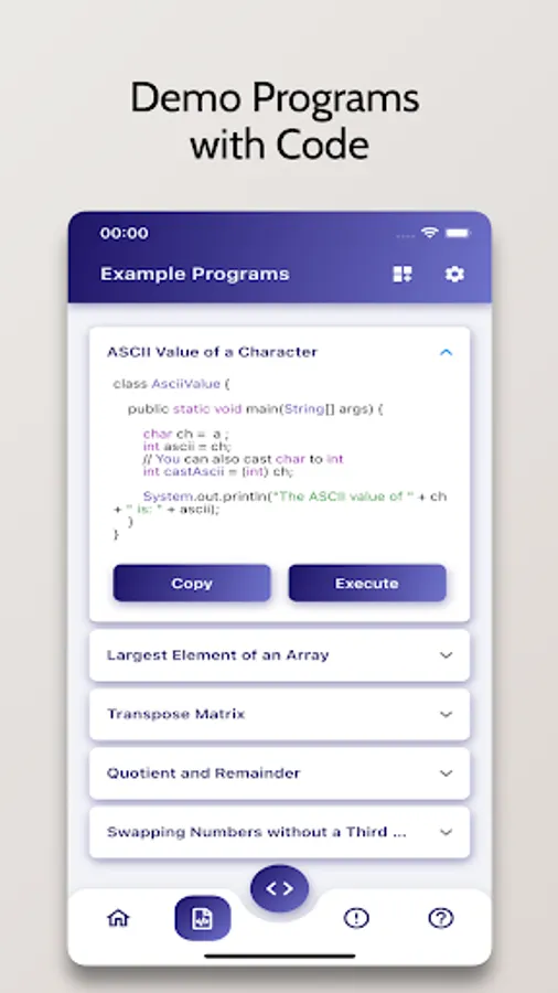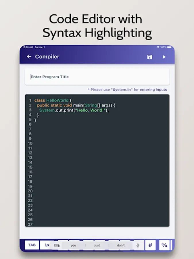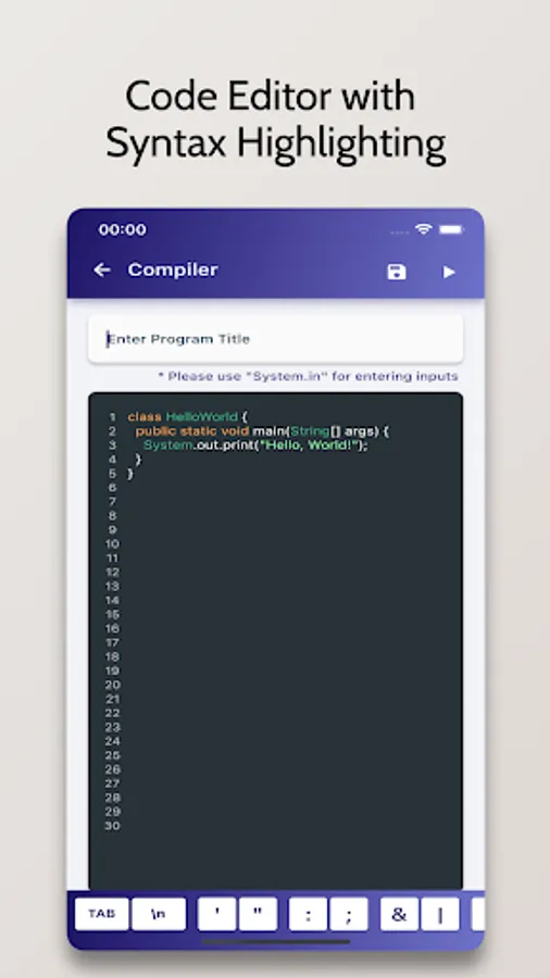 Java Compiler is an Advanced IDE enabling you to compile Java Programs on your Mobile Phone for Free. It comes with a code editor with in-built syntax highlighting capabilities.