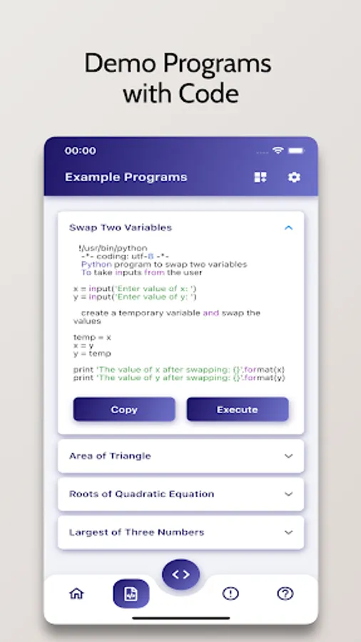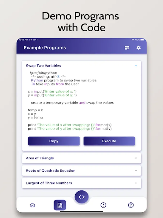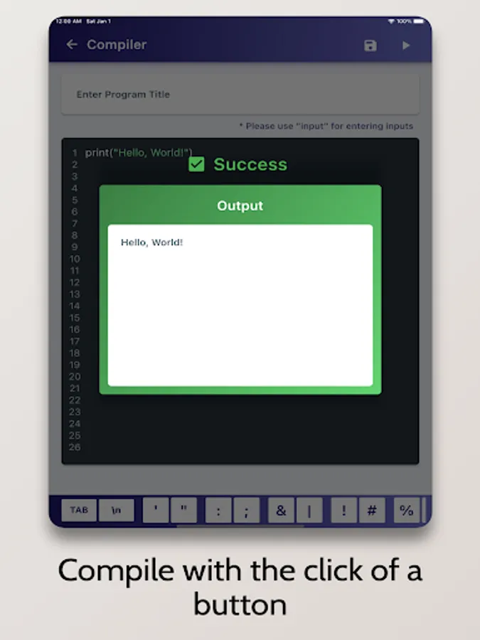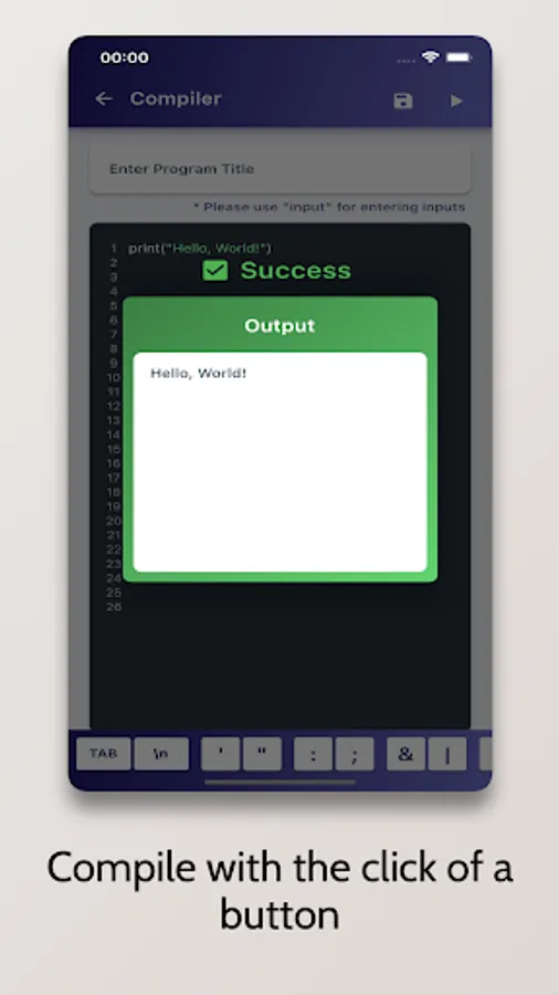 Python Compiler is an Advanced IDE enabling you to compile Python Programs on your Mobile Phone for Free. It comes with a code editor with in-built syntax highlighting capabilities.