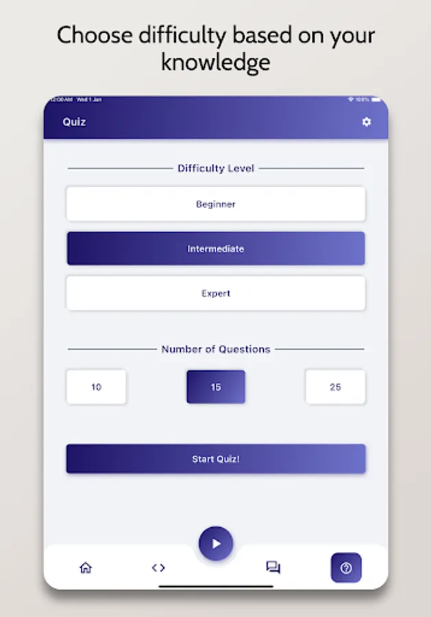 - Quizzes: Test your knowledge with multiple difficulty levels.